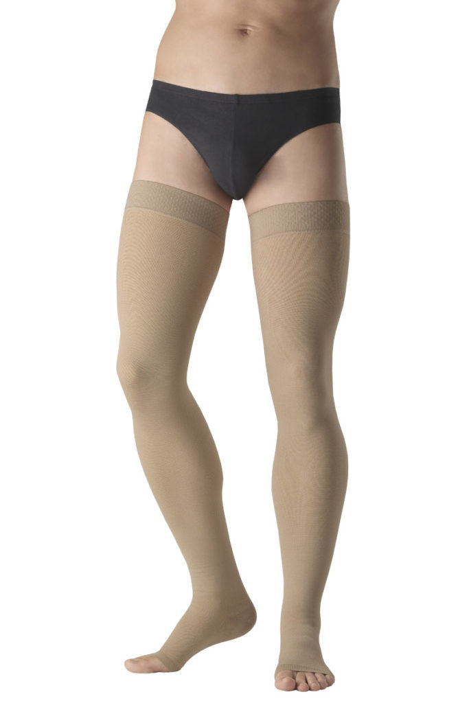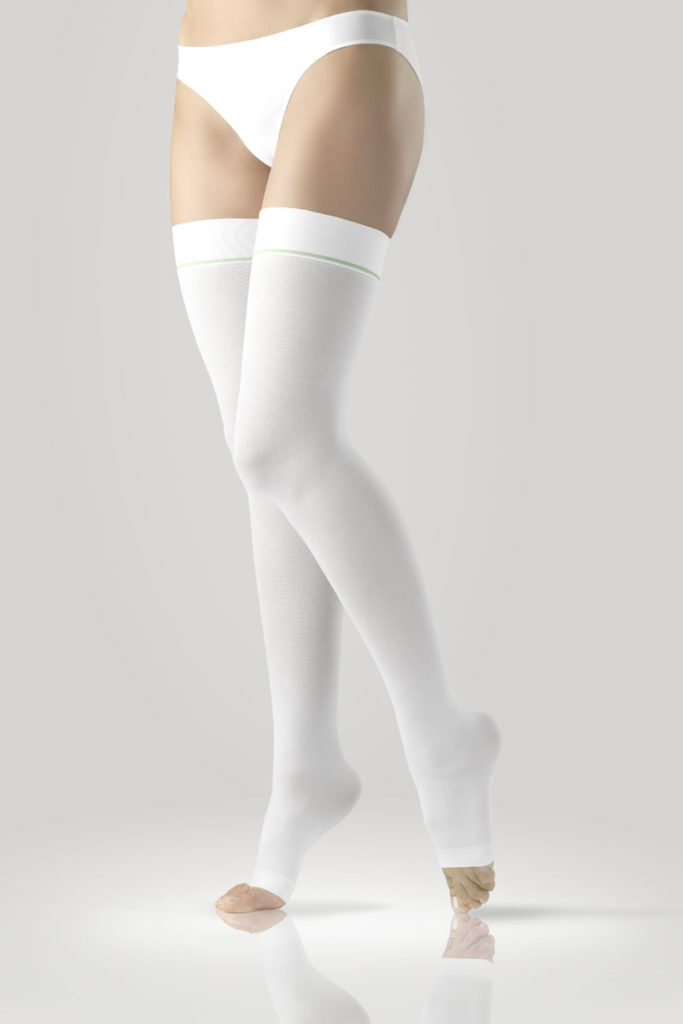 Calza elastica antitrombo a tutta coscia per la prevenzione della TVP, compressione 18 mmhg secondo il sistema RAL, colore bianco sterilizzabile in autoclave.